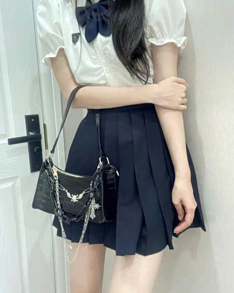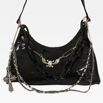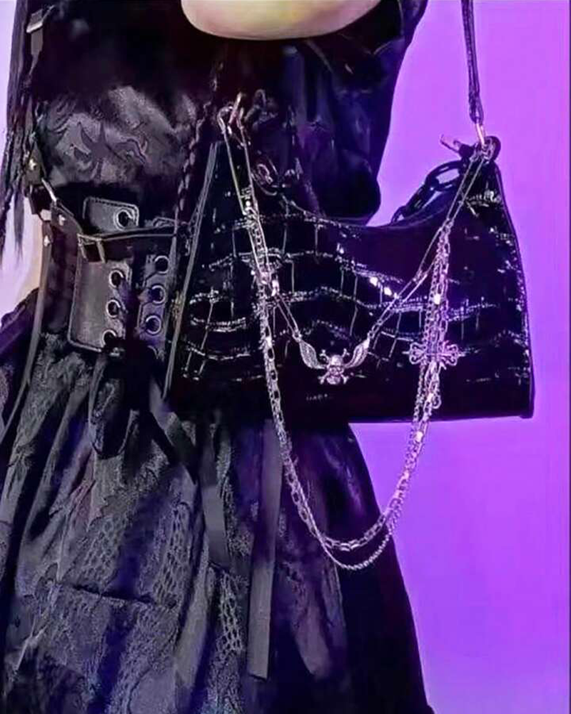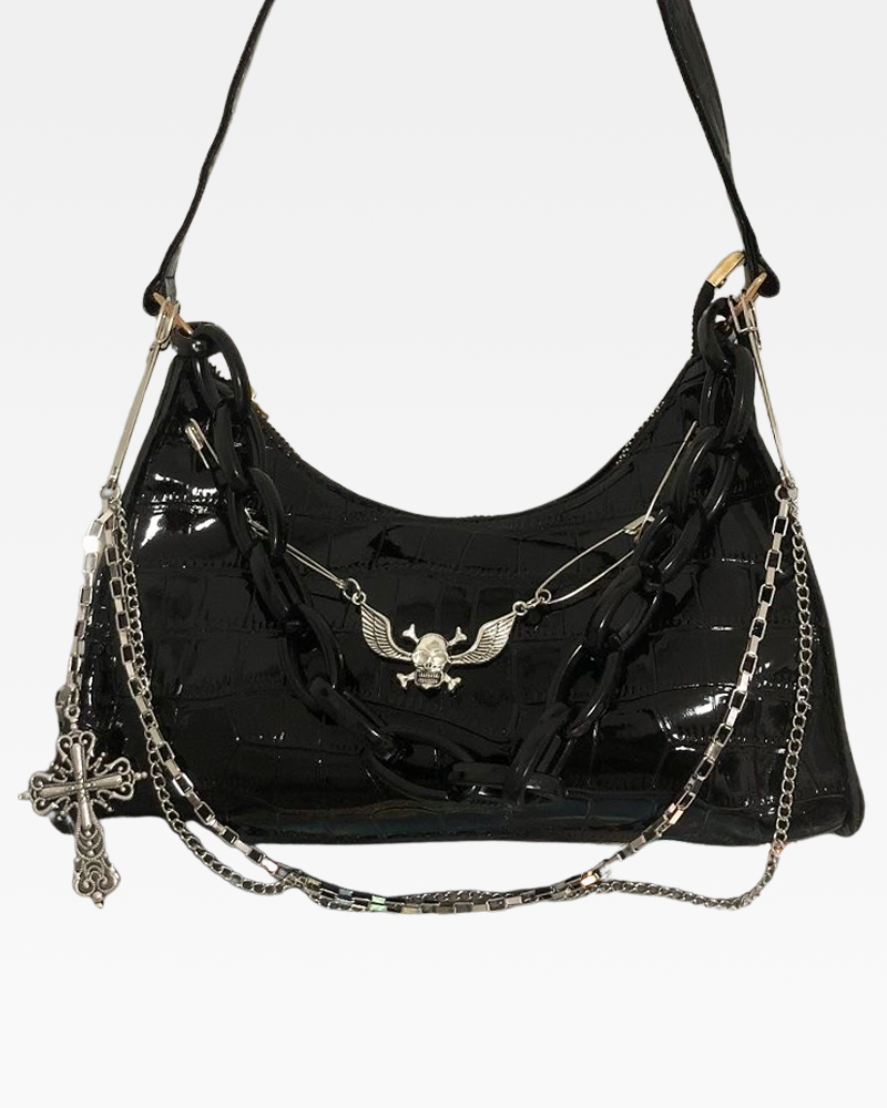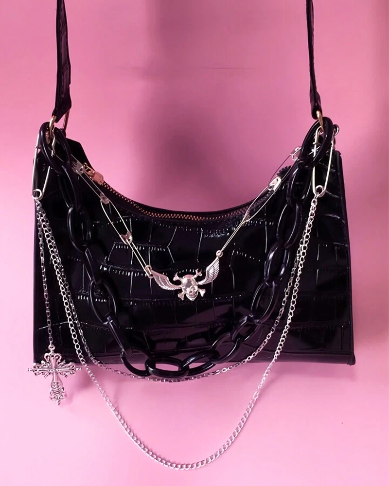 Add an instant gothic edge to your outfit with this Black Gothic Shoulder Bag. Designed with a sleek patent crocodile pattern, this bag brings together dark elegance and functionality. The detachable silver chains, cross pendant, and winged skull charm make it a true statement accessory for gothic, punk, and alt fashion lovers. Its compact yet practical size ensures you can carry your essentials while elevating your style with a bold finishing touch.