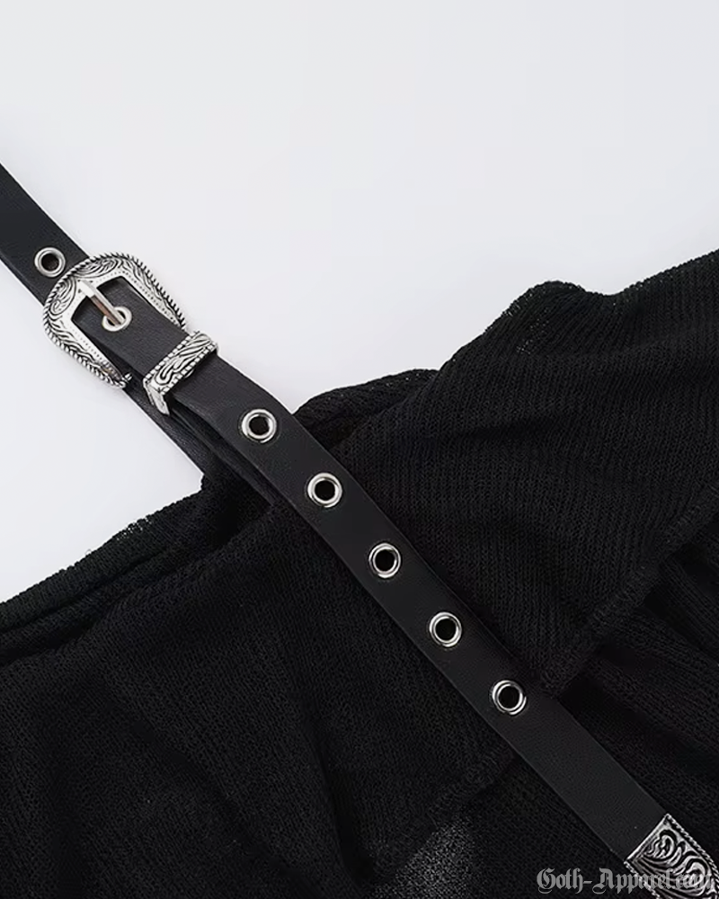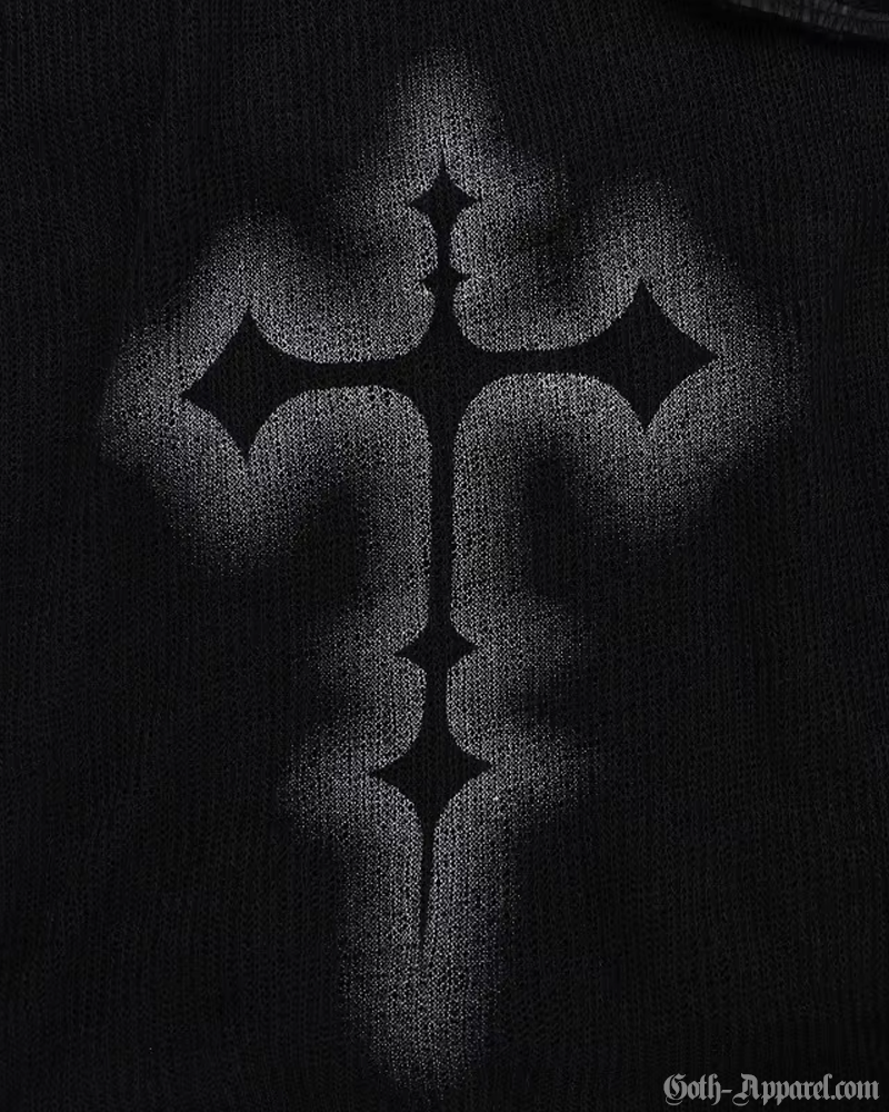Featuring a bold cross print and ruffled neckline, this asymmetrical design redefines gothic allure. Its sheer stretch fabric and strap detail create a rebellious and graceful silhouette, perfect for your night outings.