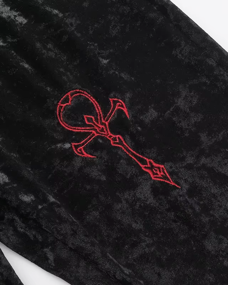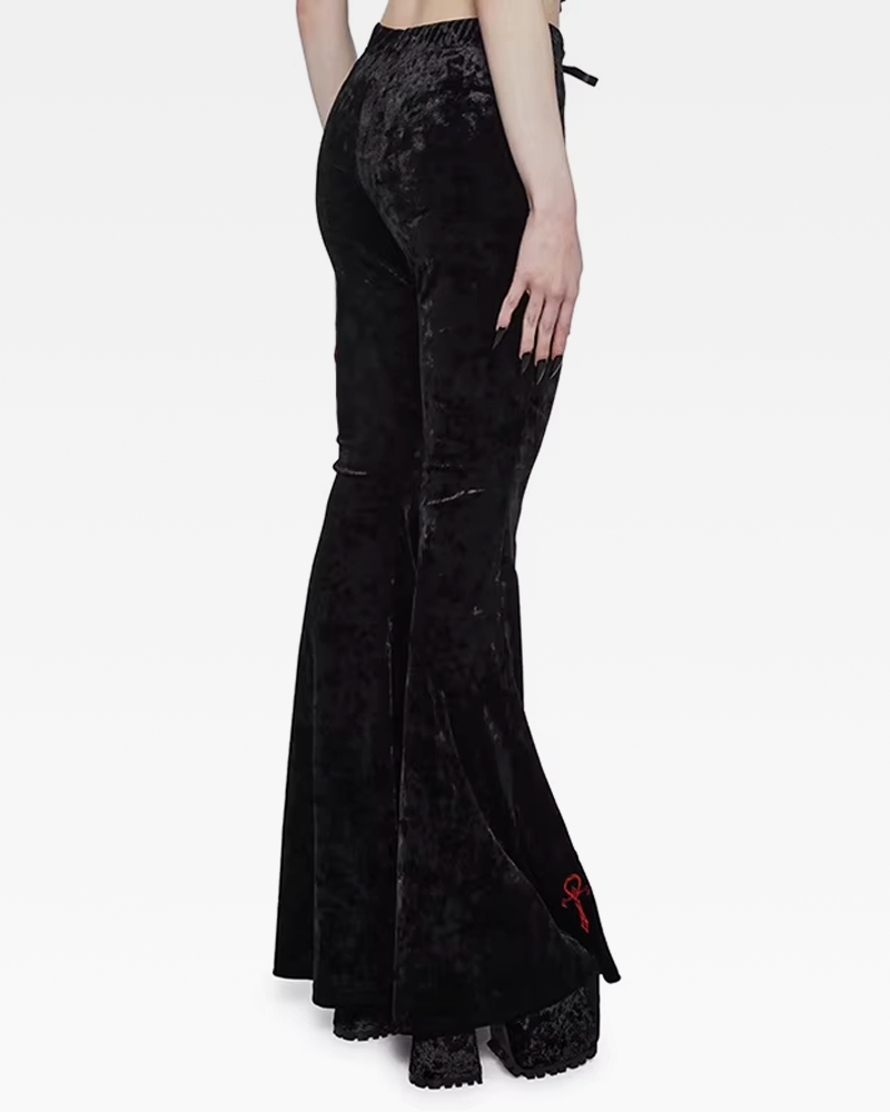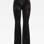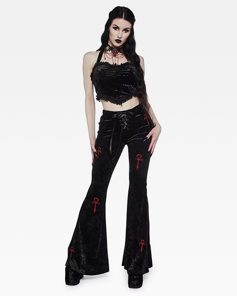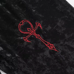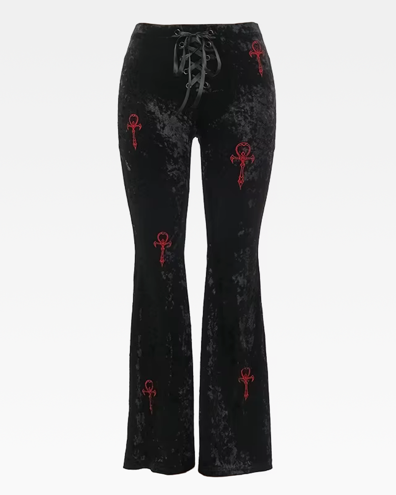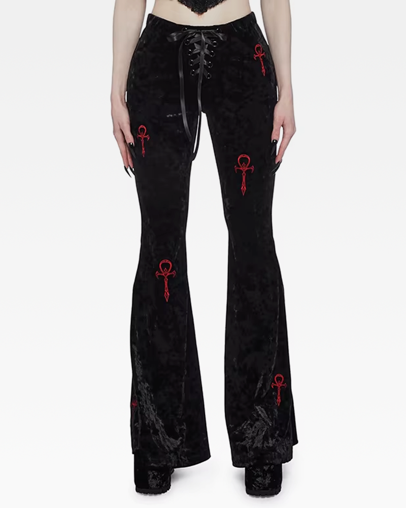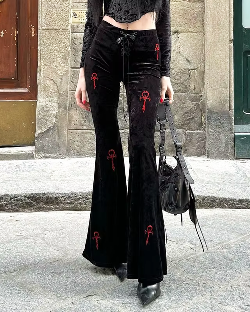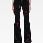 Elevate your wardrobe with these Gothic Flare Pants, designed for those who embrace dark fashion with a modern twist. Made from soft velvet, these pants combine comfort with a striking silhouette, creating a piece that's both edgy and elegant. The embroidered red ankh motifs add symbolic depth, while the flared cut enhances every step with dramatic flair. Perfect for nights out, concerts, or alternative streetwear outfits, they are a statement piece that never goes unnoticed.