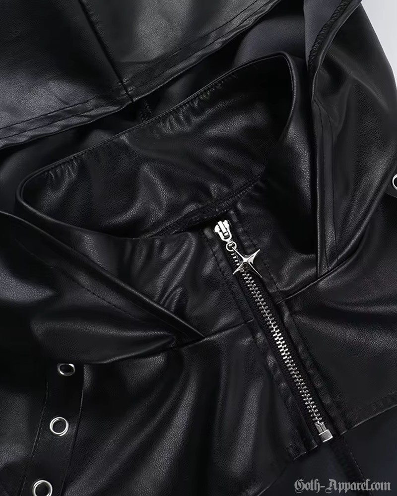 Made from vegan leather and polyester, our Gothic Hooded Harness features a structured hood with a wide drape and a cropped silhouette that frames the upper body. Adjustable shoulder straps, metal eyelet details, and a front zipper closure bring a sharp gothic edge while keeping the fit comfortable.