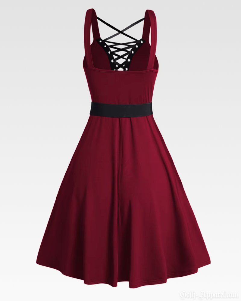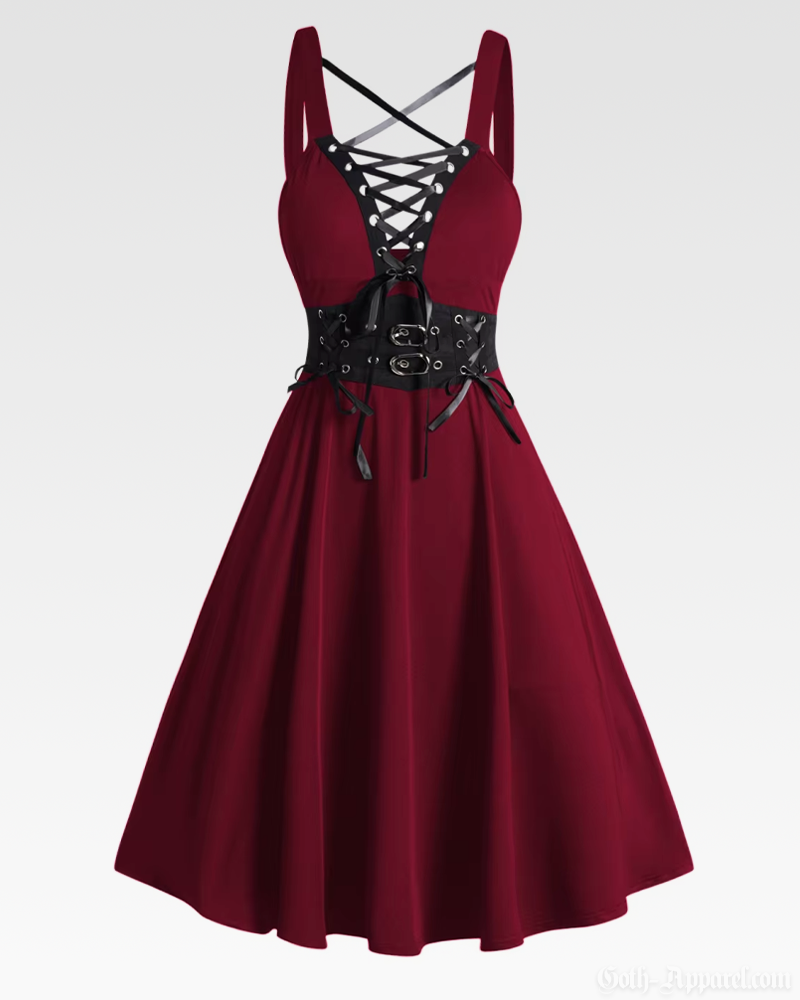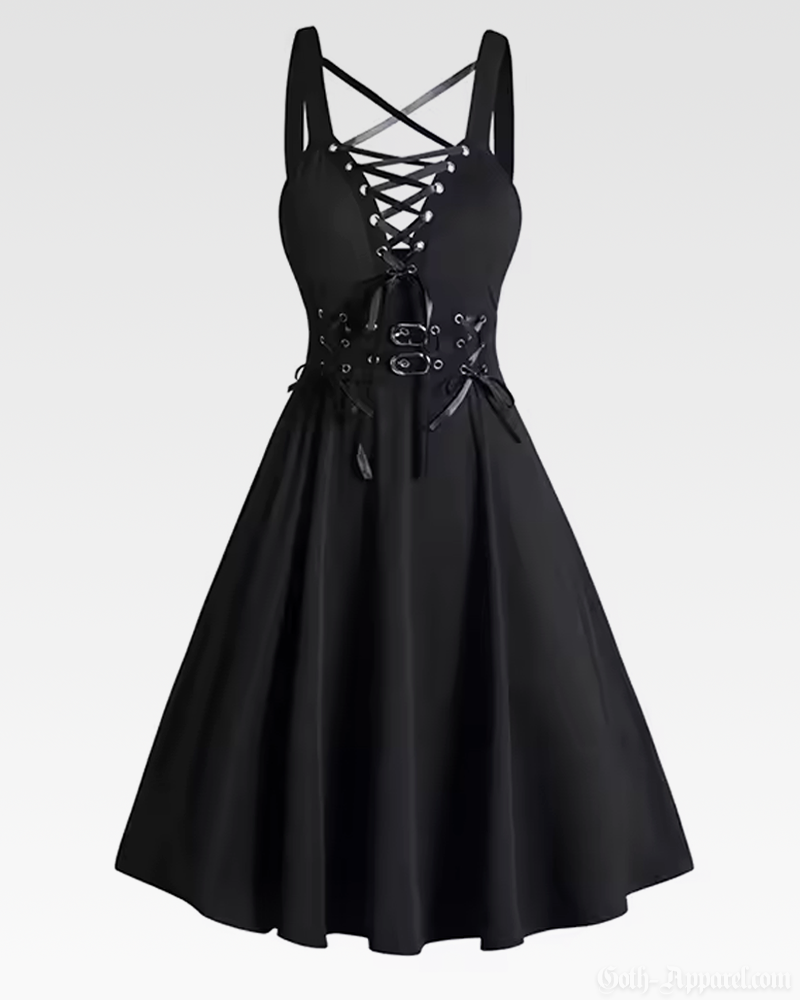 Featuring a bold lace-up front, a sculpting corset waist, and wide crossed straps, this dress blends dark elegance with everyday comfort. Its flared A-line skirt and flexible fit make it easy to style across all colors and available sizes.