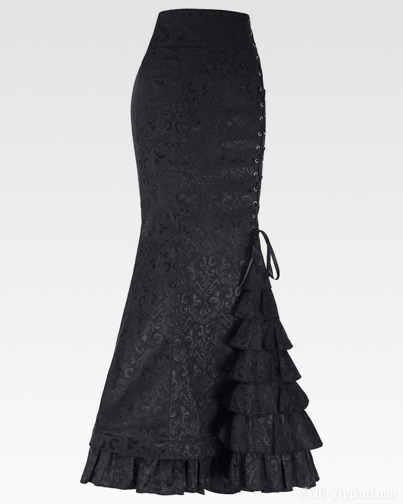 Crafted from soft polyester and spandex, this gothic mermaid maxi skirt features a textured damask pattern and a flattering high-waisted fit. Its side lace-up closure with ribbon tie and layered ruffle detailing enhance the flared hem, creating an elegant and dramatic shape.