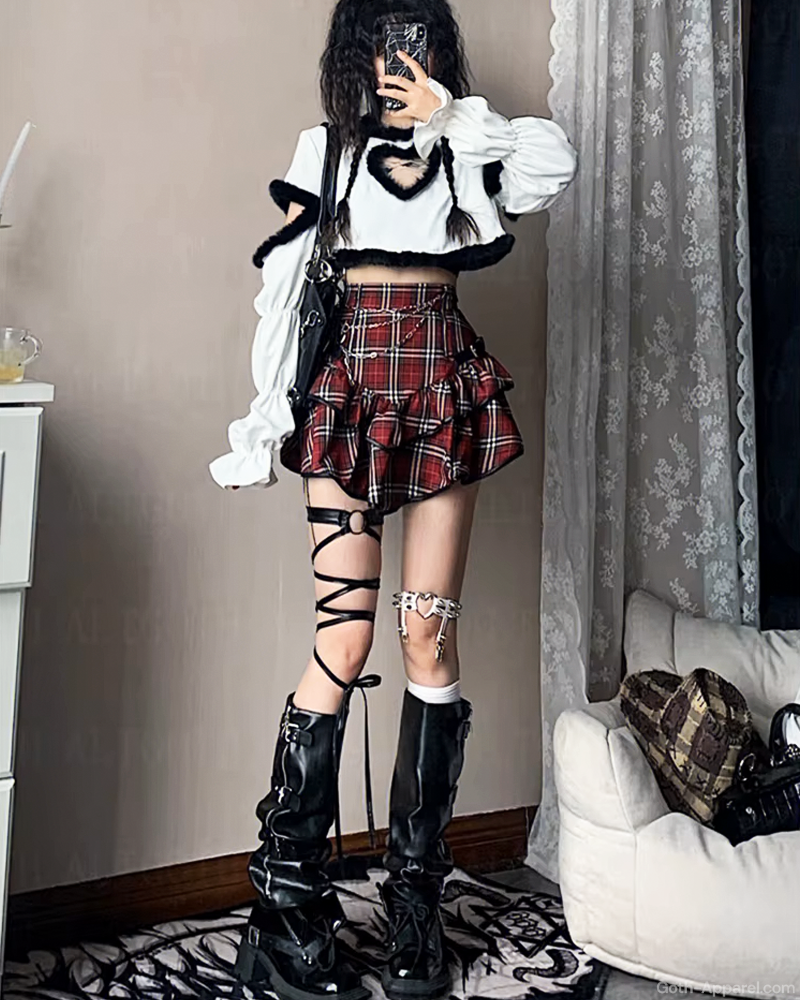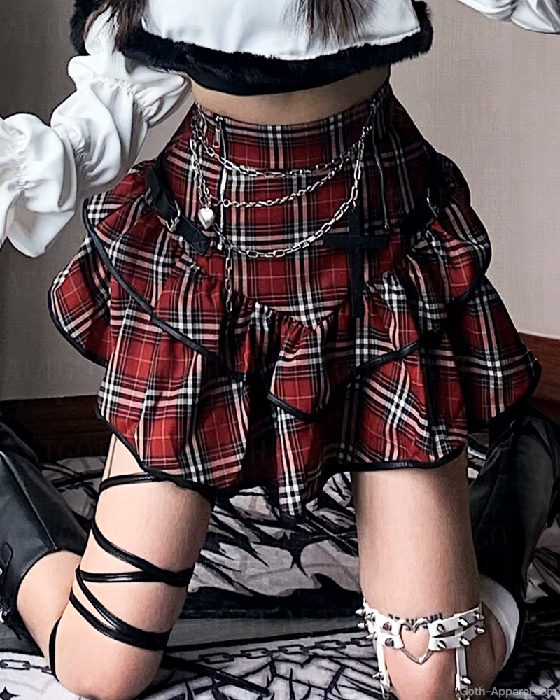 This red and black plaid mini skirt brings together grunge energy and gothic charm in one striking piece. Its layered ruffles and metal details give it an edge that stands out, perfect for turning any outfit into a statement.