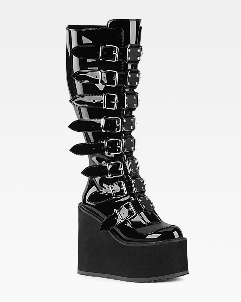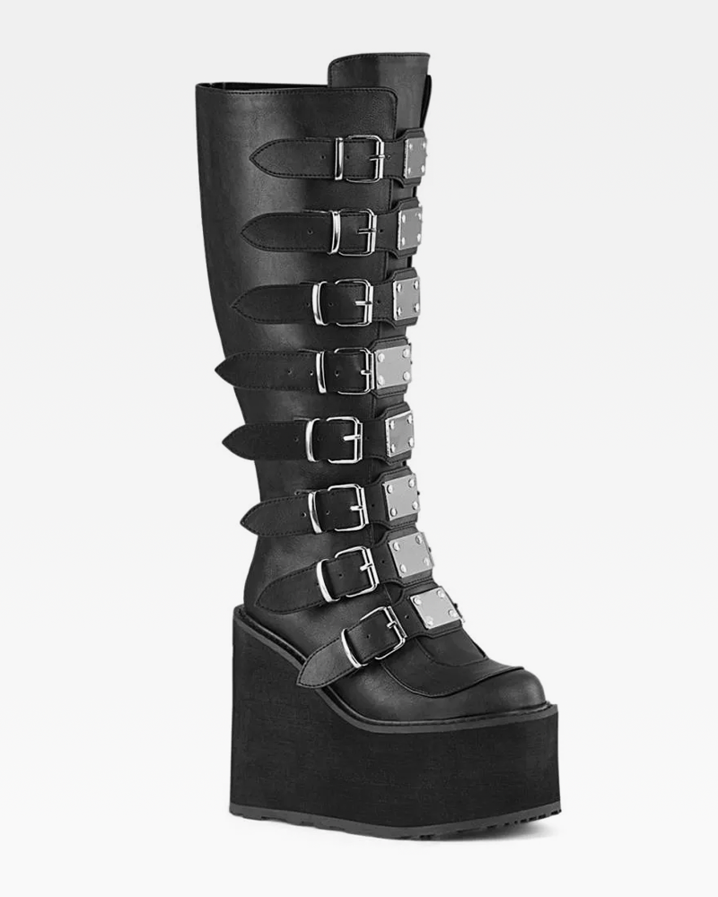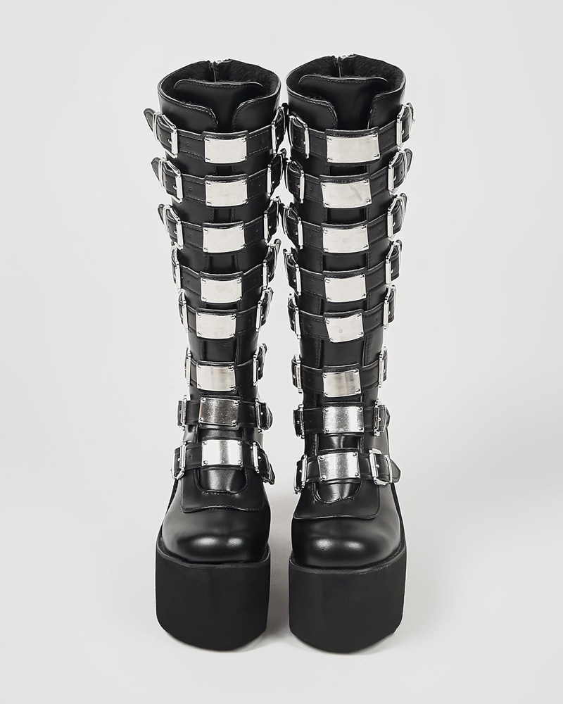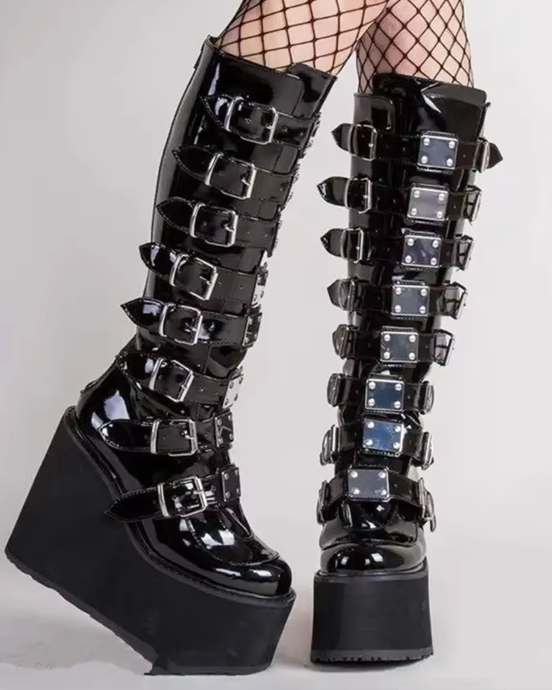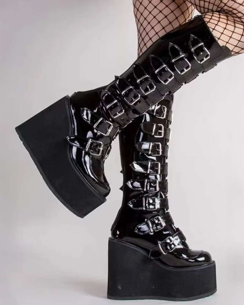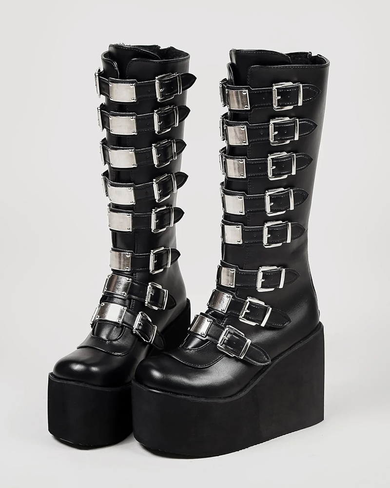 Step into the night with these Knee High Buckle Boots, designed to capture the essence of gothic fashion. With towering platforms and striking metal details, they blend durability, comfort, and edgy style in one unforgettable design.
