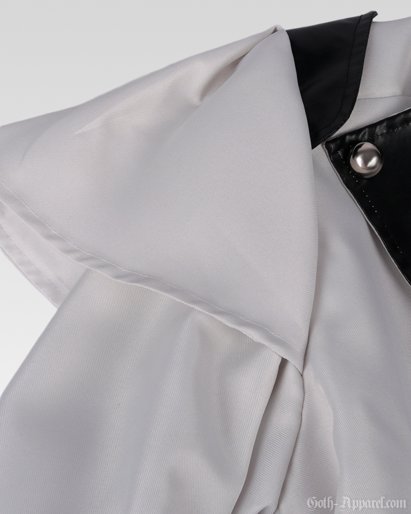 Crafted from polyester and vegan leather, this mens goth coat combines strength and refinement. Its structured shoulders, layered flaps, and buckle straps create a commanding gothic silhouette with a modern edge.