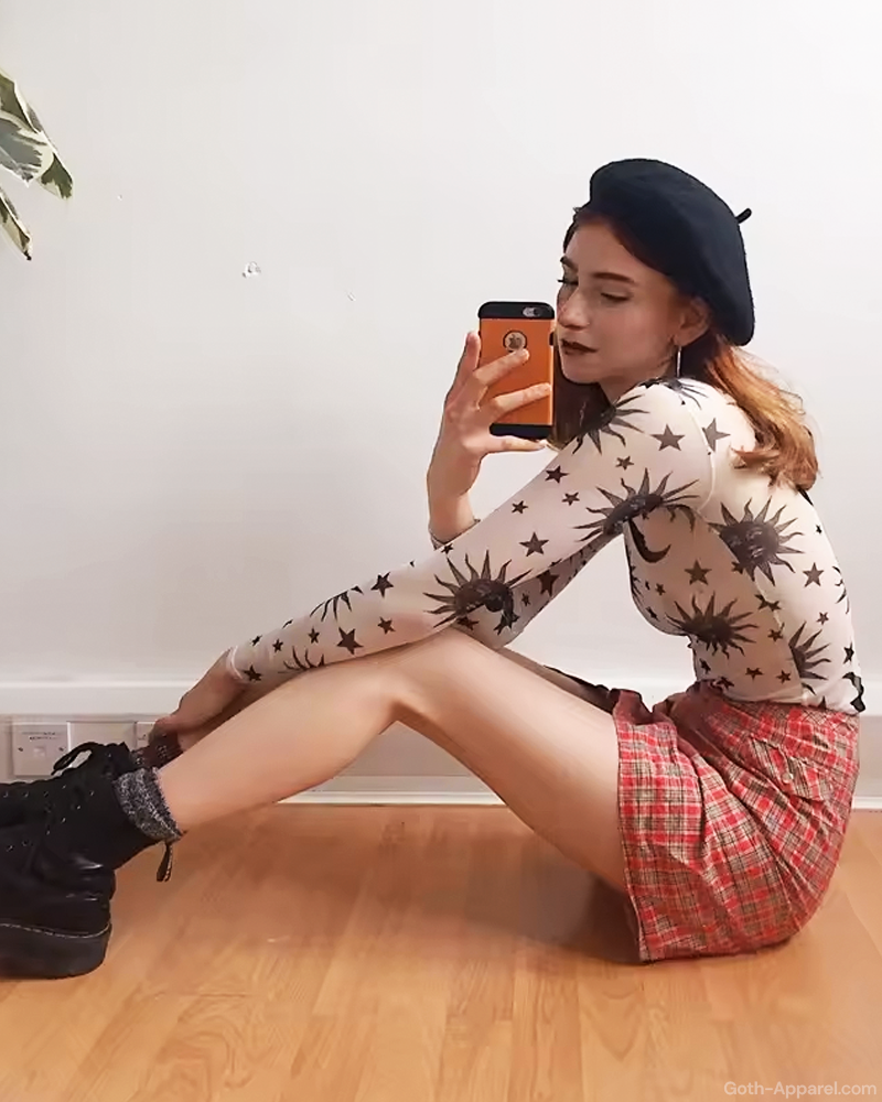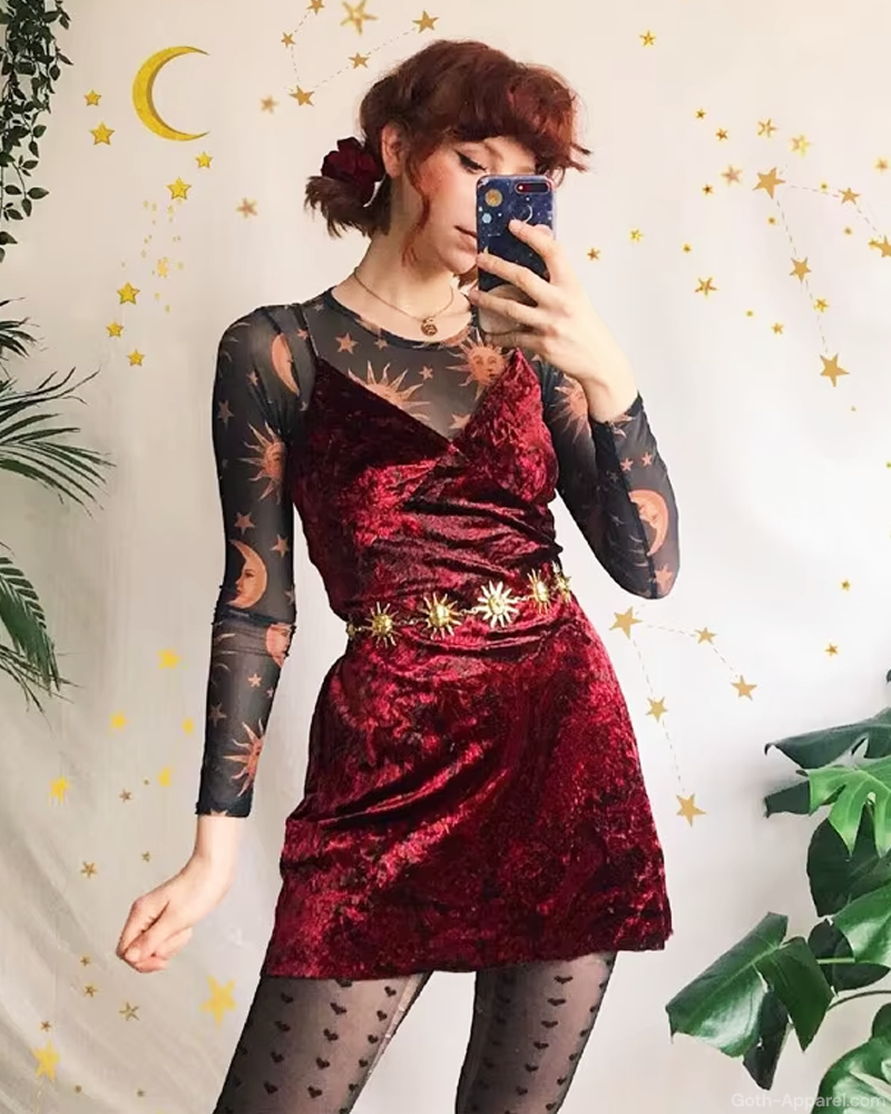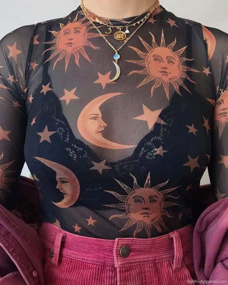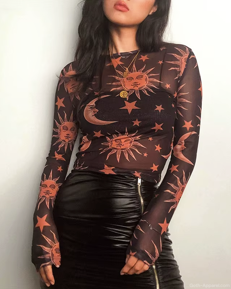 This celestial mesh top blends gothic allure with a dreamy, otherworldly vibe. Its sheer fabric and striking sun and moon print make it perfect for nights when you want your outfit to shine with a mysterious glow.