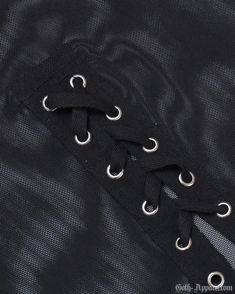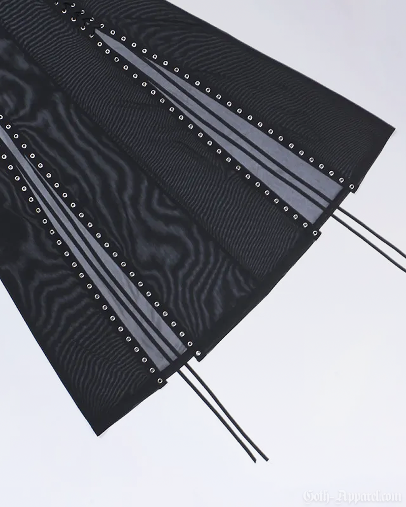 Featuring high-slitted grommet panels that frame the legs, this skirt brings a dark, fluid movement to every step. Its sheer fabric and long laces create a dramatic layered effect perfect for bold nighttime looks.