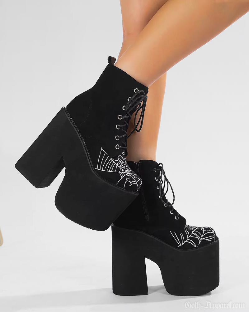 Designed in faux suede and vegan leather, our Spider Web Boots feature embroidered spiderweb details and a lace-up front with metal eyelets for a striking gothic look. The chunky platform and block heel add height and stability, while the side zipper makes them easy to slip on for everyday wear.