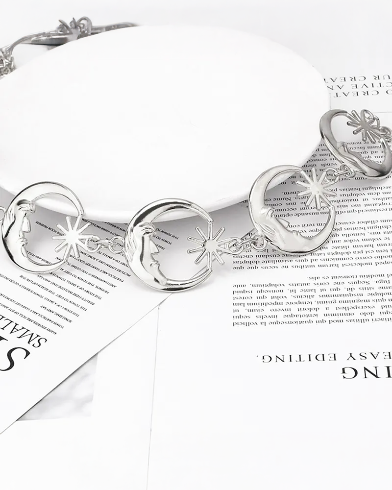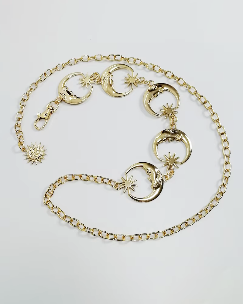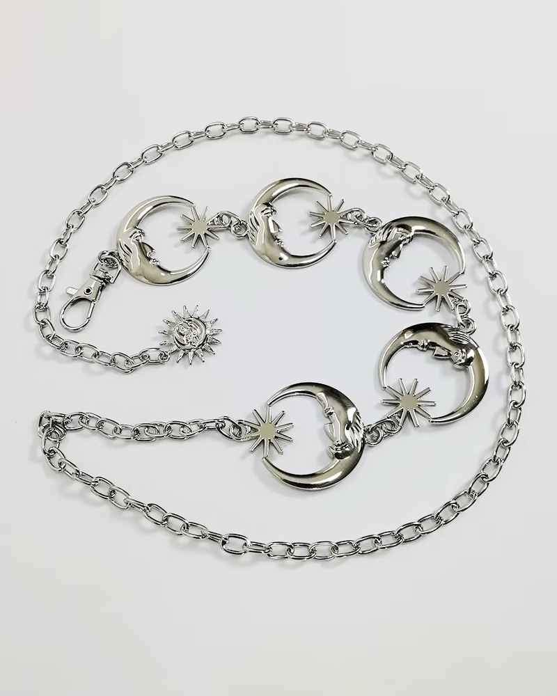 The Sun And Moon Belt is more than just an accessory, it's a statement piece that brings gothic and celestial vibes together. Designed with crescent moon and star charms, this chain belt instantly transforms your outfit into something striking and mystical. With its versatile length and adjustable design, it pairs perfectly with high-waisted jeans, skirts, or dresses, adding an edgy finishing touch to your gothic, alt, or Y2K-inspired looks.