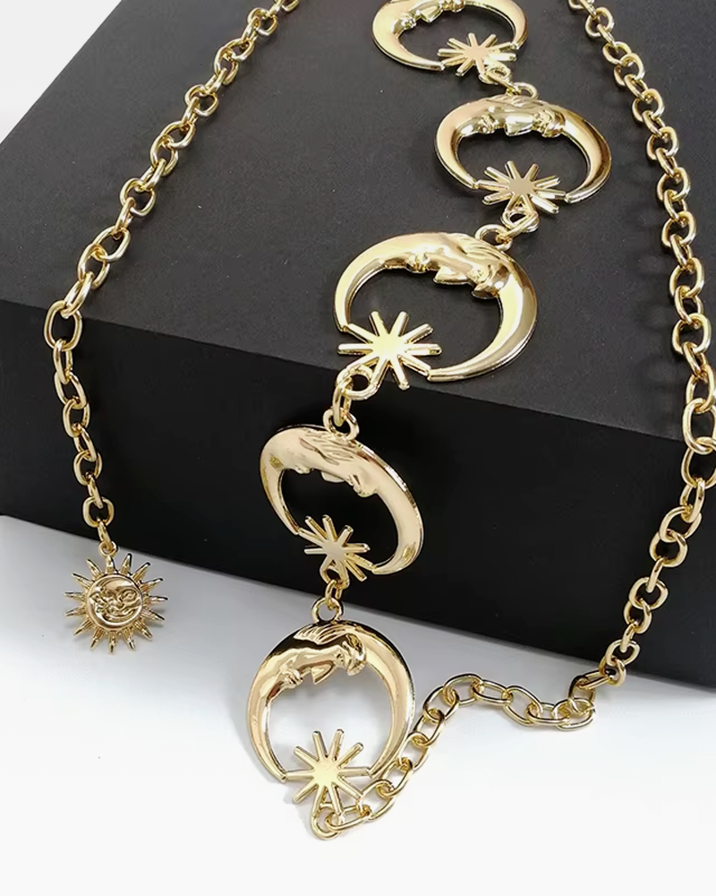 Crafted from durable metal alloy, this belt combines style with strength. The lobster clasp closure ensures a secure fit while the 41" / 105cm length allows for versatile styling options. Available in two elegant colors, it lets you choose the tone that best matches your wardrobe. With its celestial-inspired design, the Sun And Moon Belt is the perfect piece to elevate your everyday outfits into standout gothic fashion statements.