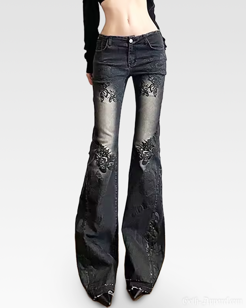 Featuring a low-rise cut and flared legs, these jeans play with proportions to create a confident, elongated shape. The washed black base is enhanced by subtle dark floral prints, finished with classic five-pocket styling and a clean button-and-zip closure.